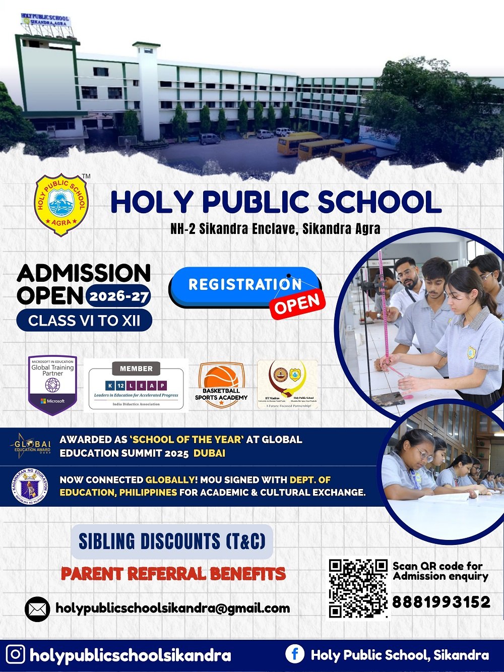 Situated on the side of NH-2 on Sikandra Road, Holy Public School is a school that every child dreams of, a Big campus with U shaped academic building and very big open space for sports and games. The school was established in the year 1979. Affiliated to Central Board of Secondary Education, New Delhi (CBSE) the school has classes for VI to XII. The school boasts of a strength of 2200 students.