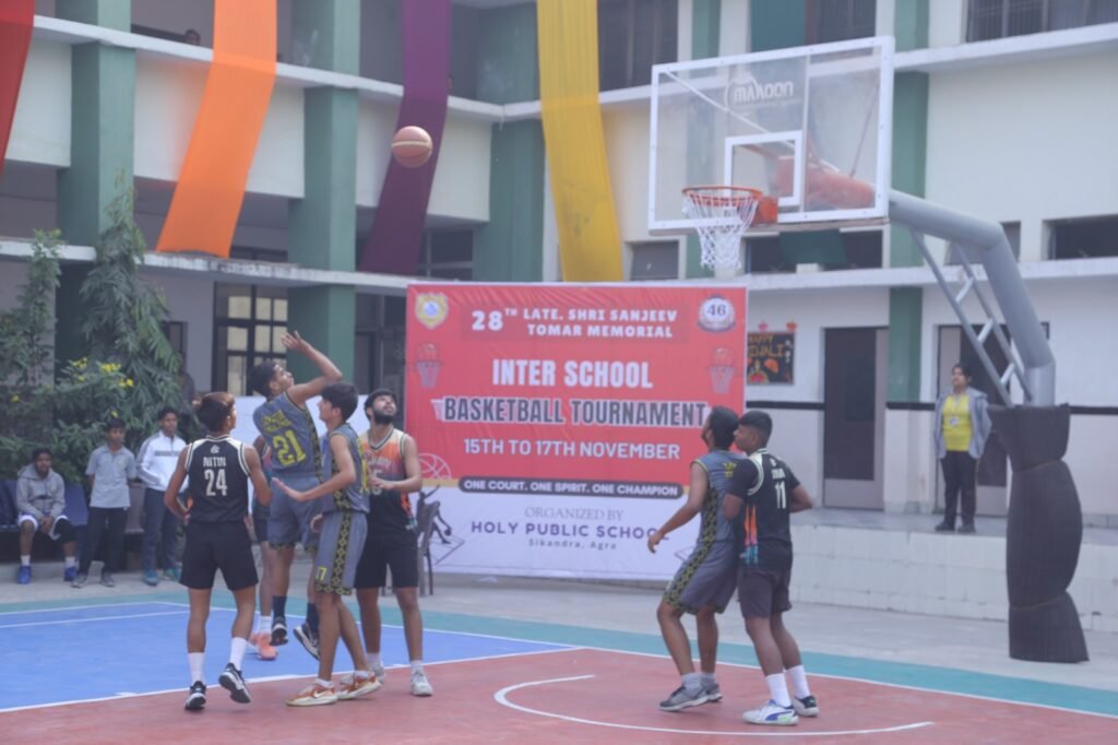 The Finale of the 28th Late Shri Sanjeev Tomar Memorial Basketball Tournament at Holy Public School, Sikandra showcased thrilling semi-final and final clashes marked by exceptional skill and sportsmanship. The concluding ceremony was graced by Chief Guest Mr. Shailesh Kumar Pandey, DIG Agra Zone, along with esteemed Guests of Honour.